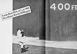 DiMaggio had a hand in holding the Phillies at bay long enough to get his key at-bat. Leading off the sixth inning, Del Ennis hit a deep fly to center, but DiMaggio made a spectacular over-the-shoulder running catch, near the 400-foot (120 m) marker at the base of the scoreboard in right-center. This play is far less well-known but was similar-looking to the famous Willie Mays catch in the 1954 World Series. DiMaggio made this play on the road, although in a ballpark which he played in during the regular season (Shibe Park was also the home of the Philadelphia A's). Because there was nobody on when the ball was hit, he was not in a hurry to get the ball back to the infield (Mays' famous 1954 catch was deeper, with two runners on base and nobody out when the ball was hit).