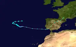 The system moved west-southwestward, atypical for cyclones in that region during September. On September 9, the storm turned to the southeast, reaching estimated peak winds of 50 mph (80 km/h), based on ship observations. Moving slowly through the northern Azores, the storm produced winds of 35 mph (56 km/h) along Terceira Island. It slowly weakened, and by late on September 10 the system degraded into a tropical depression. By the next day, the system was interacting with an approaching cold front, indicating that the depression had transitioned into an extratropical cyclone. Around 20:00 UTC, the storm moved ashore the southwestern tip of Portugal with gale-force winds. The storm turned to the northeast through the Iberian Peninsula, dissipating on September 14 over southwestern France.[12]