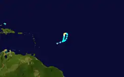 On September 22, a tropical wave moved into the eastern Caribbean Sea,[1] spawning a tropical depression near Hispaniola early on September 24.[4] As it tracked west-northwestward, the low dropped heavy rainfall, peaking at 4.42 in (112 mm) in Christiansted, United States Virgin Islands, as well as 11.9 in (300 mm) in Garzas, Puerto Rico.[15] In Puerto Rico, the rains caused landslides that affected seven towns, notably Ponce, the island's second-largest city.[16] There, at least 14 buildings were destroyed.[17] The floods left more than 1,000 people homeless, 300 of whom took refuge in a Red Cross shelter.[16] Overall, the flooding on the island killed four people and left moderate damage of around $1 million (1952 USD, $11.8 million 2025 USD).[1]