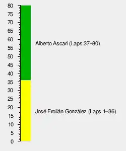 José Froilán González emerged in first place at the start of the race, ahead of Ascari in second. The Argentine remained in the lead for the first 36 laps of the race, until a slow pit stop allowed the Ferraris of Ascari and Villoresi to pass him for first and second, respectively. Ascari held the lead for the remainder of the race, and, in so doing, took his sixth consecutive World Championship race victory. González caught up with Villoresi and passed him to take second place in his only Championship race of the season. Villoresi completed the podium by taking his second consecutive third-place finish. Farina was not far behind in fourth place, while the second Maserati of Felice Bonetto took the final points position in fifth, finishing a lap down on the leaders. The remaining works Ferraris of Simon and Taruffi finished in sixth and seventh place, respectively.[1]