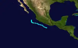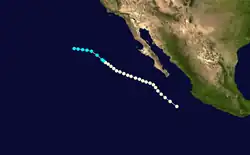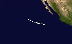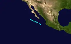 A hurricane developed on September 15 southwest of Baja California and dissipated seven days later.[1] Moisture from Five produced 2 in (51 mm) of rainfall in the deserts and mountains of central and southern California.[2]