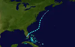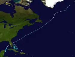 On October 3, a tropical storm developed near the southern coast of Cuba. It moved northwestward, crossing the island before turning to the northeast. Early on October 5, the storm brushed southeastern Florida,[8] producing gusty winds and rainfall. The threat of the storm prompted small craft warnings from the Florida Keys through South Carolina.[33] As it accelerated northeastward, the storm strengthened slightly to maximum sustained winds of 45 mph (75 km/h), before becoming extratropical on October 6. Two days later, the remnants moved over Atlantic Canada with winds of 70 mph (120 km/h),[8] producing flooding rainfall that washed out several roads. The storm caused two deaths after it wrecked a boat in Broad Cove, Nova Scotia.[34] Later, the cyclone passed south of Greenland before dissipating southwest of Iceland on October 10.[8]