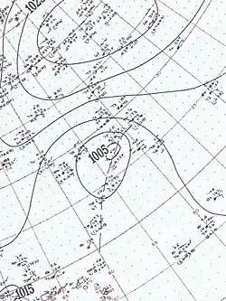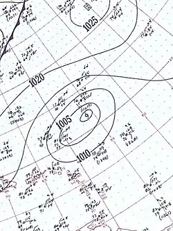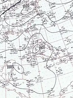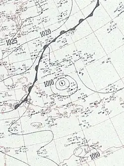 On August 29, a tropical storm developed over southern Florida.[8] While moving through the state, the storm dropped heavy rainfall, reaching 4.67 in (119 mm) at Fort Lauderdale Beach; similar rainfall was observed in the northern Bahamas. Described by one Weather Bureau forecaster as "wide and flat", the storm gradually organized over the western Atlantic Ocean.[20] On August 31, the storm turned to the northwest, with maximum sustained winds of 40 mph (65 km/h). The system weakened to a tropical depression before moving ashore near Savannah, Georgia on September 1. It dissipated that day over land.[8]