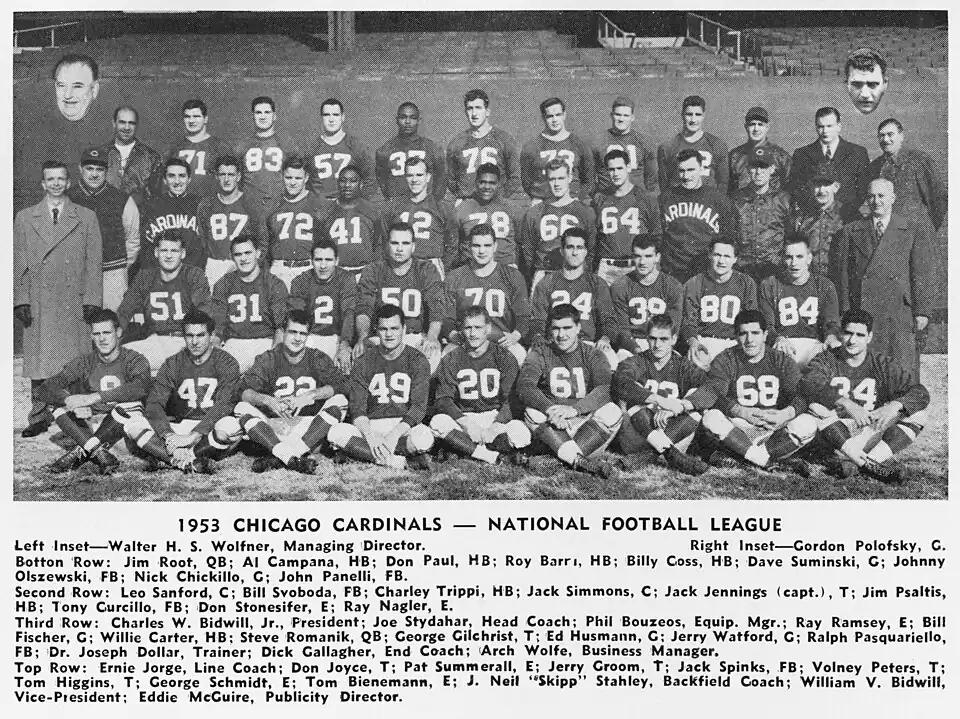 The 1953 Chicago Cardinals season marked the 34th year the team was in the National Football League (NFL). The team failed to improve on their previous output of 4–8, winning only one game, the final game of the season.[ 1] They thus failed to qualify for the playoffs for the fifth consecutive season.