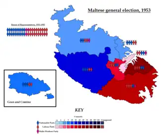 General elections were held in Malta between 12 and 14 December 1953.[1] The Malta Labour Party emerged as the largest party, winning 19 of the 40 seats. However, the Nationalist Party formed a government with the Malta Workers Party on 9 January 1954 with Giorgio Borġ Olivier continuing as Prime Minister.[2]
