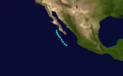 A tropical cyclone first formed on September 13 near Western Mexico (in the extreme southern Gulf of California) while generating winds of 30–40 mph (50–65 km/h). It traveled north-northeastward[3] and Three was upgraded into a hurricane on September 14 while reaching its maximum sustained wind speed of 85 mph (135 km/h).[6] After turning east-northeast, Hurricane Three attained its peak pressure of 982 mbar (29.0 inHg).[3] The storm held on to its wind speed, until September 17, when the storm dissipated.[6] The remnants of the storm deluged the Mexican coast with rain, especially in Sinaloa. Winds of 45 mph (70 km/h) were reported in Mazatlan on land; however, no damage was recorded.[3]