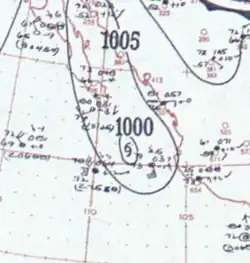 Thunderstorm activity off the Mexican coast was quite for the first half of August. Based on data from six ships, a closed atmospheric circulation may have formed near the Revillagigedo Islands at 0000 UTC on August 23, which are situated roughly 350 mi (565 km) south of the Baja California Peninsula. At this time, winds were estimated to be no higher than 28 mph (45 km/h). After formation, One moved west-northwest[3] and on August 25, the storm attained its peak intensity of 50 mph (80 km/h).[6] Furthermore, the ship S.S. Sirocco measured a minimum barometric pressure of 981 mbar (29.0 inHg). Although the WBOLA reported that the storm dissipated that night near the peninsula,[3] the HURDAT database suggests that the storm maintained peak intensity for another day, until August 27 when it dissipated.[6]