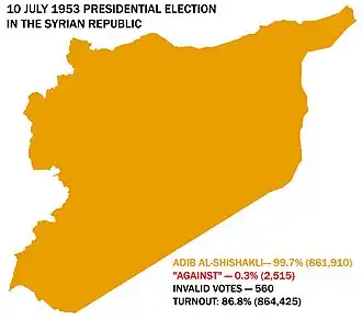 Presidential elections were held in Syria on 10 July 1953.[1] There was only one candidate, Adib Shishakli. According to the official results, of the 864,425 voters who cast votes, 861,910 voted for Shishakli while 2,515 cast invalid votes.[2] The election took place on the same day as the 1953 Syrian constitutional referendum.