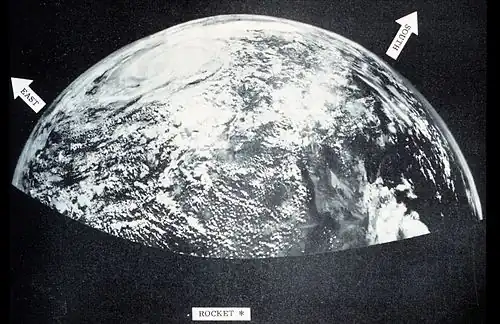 When the system reached the Big Bend region on October 5 it reintensified slightly. Around that time, the United States Navy conducted a rocket test from White Sands, New Mexico; this was despite that such tests were rarely performed when the skies were cloudy. The rocket took an unintended photograph of the depression from an altitude of about 100 miles (160 km), which became the first such large-scale image of a tropical cyclone.[50] The depression later moved into New Mexico and dropped additional rainfall,[50] interacting with an approaching cold front.[52] Flooding was reported around Roswell,[50] as well as along the Pecos River system. Rainfall in the state peaked at 9.8 in (250 mm) in Canton, New Mexico. The system dissipated on October 7.[52]