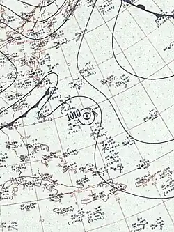 A low pressure area was present north of the Yucatán Peninsula on September 14. Nearby ship observations indicated that a tropical depression developed the next day in the central Gulf of Mexico, although the system's large structure meant it could have been a subtropical cyclone. The system moved slowly westward, bringing winds of 30 mph (48 km/h) to the coast of Louisiana. It is estimated that the storm reached peak winds of 45 mph (72 km/h) on September 16, based on reports from ships and the Hurricane Hunters. On the next day, the system began weakening over water, dissipating on September 18 without moving ashore.[11]