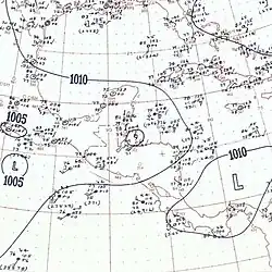 On July 27, a tropical depression developed in the northern Gulf of Mexico, about 100 mi (160 km) south of Grand Isle, Louisiana.[4] A map of the low pressure areas forming in July 1954 indicated that the system originated near the Mississippi Delta and tracked southward.[17] After forming, the depression tracked northwestward, intensifying into Tropical Storm Barbara early on July 28. Maximum sustained winds reached 45 mph (72 km/h),[4] although a tanker offshore named the Henry M. Dawes reported wind gusts of 60 mph (97 km/h).[6] Officials at the United States Weather Bureau posted a storm warning from Cameron to Burrwood, Louisiana, and also advised small craft to remain at port along the entire northern Gulf Coast.[18] Without intensifying further, Barbara made landfall near Vermilion Bay, Louisiana on July 29,[6] dissipating the next day over Texas.[4] The storm dropped heavy rainfall along its path,[6] including over 2 in (51 mm) in New Orleans.[19] The rains caused flooding as well as some damage to the rice crop.[20] However, the Monthly Weather Review yearly summary described the precipitation as "far more beneficial than damaging". There was no wind damage.[6]