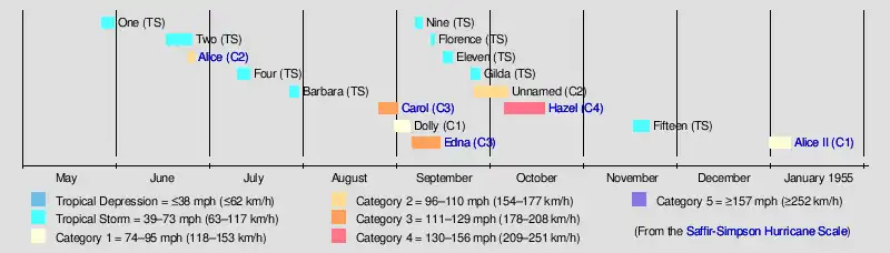 The hurricane season officially began on June 15, when the United States Weather Bureau in Miami, Florida, began 24‑hour operations. The agency, under the direction of Grady Norton had access to 43 other weather stations across the Atlantic basin.[2] Norton died during the season from a stroke while tracking Hurricane Hazel.[3] Additionally, a group of Hurricane Hunters planes were put on standby for the season, able to be flown out into storms and collect data.[2] During the season, there were eight named storms,[3] as well as an unnamed hurricane and a tropical depression.[4] The season officially ended on November 15,[3] although an unnamed tropical storm formed a day later.[4] In addition, Tropical Storm Alice developed on December 31, the latest a tropical cyclone has developed in the calendar year.[5]