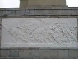 On the sides of the monument's pedestal are reliefs depicting heroic people of Wuhan fighting the flood, raising banners and placards with quotations from Mao Zedong.