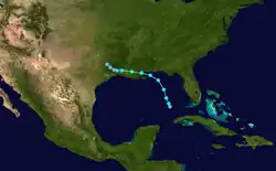 A weak disturbance was first observed near Grand Cayman on August 23.[4] The disturbance moved northeastward into the Gulf of Mexico, where it became a tropical depression late on August 25. Early the next day, the depression intensified into a tropical storm. The tropical storm marginally strengthened further, peaking with maximum sustained winds of 45 mph (72 km/h) by 0000 UTC on August 27. Nearing the Gulf Coast of the United States, the system curved towards the west.[7] The storm maintained its intensity up until landfall in Louisiana near New Orleans about four hours later.[4] Moving inland, it slowly weakened while crossing the Central United States, degenerating to tropical depression strength by August 28 and dissipating over east-central Texas several hours later.[7]