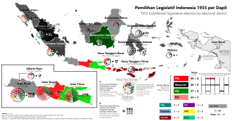 Legislative elections were held in Indonesia on 29 September 1955 to elect the 257 members of the House of Representatives. The election was the first national election held since the end of the Indonesian National Revolution, and saw over 37 million valid votes cast in over 93 thousand polling locations. The result of the election was inconclusive, as no party was given a clear mandate. The legislature which was elected through the election would eventually be dissolved by President Sukarno in 1959, through Presidential Decree number 150.