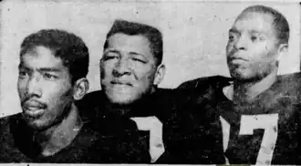 ![]() Iowa's "Steubenville Trio": halfback Eddie Vincent (left), guard Cal Jones (center), and end Frank Gilliam (right) | |