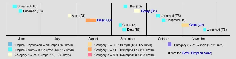 The season officially started on June 15, although an unnamed storm developed about a week prior over the western North Atlantic Ocean. A later storm that formed over the Gulf of Mexico on June 12 alleviated drought conditions in the south-central United States. Hurricane Anna developed in late July and hit Mexico. Tropical storms Carla and Ethel both formed near the Bahamas and moved northeastward until dissipating. The only hurricane that hit the contiguous United States was Hurricane Flossy. One of the final storms of the year, Greta, was an unusually large hurricane that produced high waves from Florida to the Lesser Antilles. It developed in the western Caribbean and moved across much of the southeastern United States, causing $24.8 million in damage and 15 deaths.