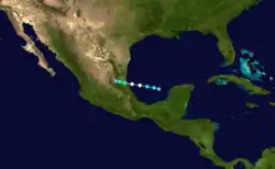 A westward-moving tropical wave traversed the Lesser Antilles on July 20. It moved across the Caribbean, and its thunderstorms increased on July 23 while passing south of Cuba and beneath a high-pressure area. There is evidence that it could have developed a circulation on July 24 before it struck the Yucatán Peninsula. It is confirmed to have developed into a tropical depression on July 25 in the Bay of Campeche. As it continued west-northwestward, it rapidly intensified into Tropical Storm Anna, and before moving ashore in Mexico near Ozuluama, Veracruz, on July 26 it attained hurricane status. Peak winds reached 85 mph (135 km/h), although Anna rapidly dissipated on July 27 as it moved further inland.[9] The high winds wrecked several homes in poor regions of Tampico, Tamaulipas, while rainfall of 2.5 in (64 mm) resulted in flooding.[5] The high winds severed telegraph lines from Tampico to San Luis Potosí. The same area was affected by several hurricanes in the previous year.[12] Damage totaled around $50,000, and there were no deaths.[5]
