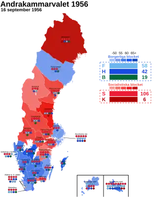 General elections were held in Sweden on 16 September 1956.[1][2] The Swedish Social Democratic Party remained the largest party, winning 106 of the 231 seats in the Andra kammaren of the Riksdag.[3] A Social Democratic-Farmers' League coalition government was formed by Prime Minister Tage Erlander after the election with 125 of the total of 231 seats. Although the non-socialist parties held a majority in the Second Chamber, the Social Democrats held a majority in the First Chamber, so a non-socialist government could not be formed.
