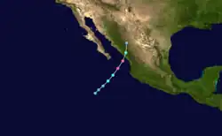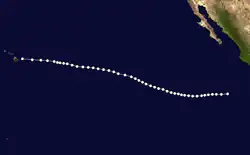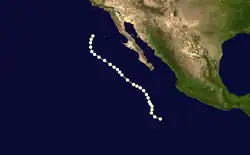 The tenth known storm of the season was identified on October 1 several hundred miles southwest of the tip of the Baja California Peninsula. Maximum winds observed during the storm's existence reached 85 mph (135 km/h); however, no air pressure was recorded. Initially tracking westward, the system turned northwest and later northeast by October 3. After a brief acceleration on October 4, the hurricane slowed as it neared the coastline of Baja California. Early on October 5, the storm crossed the Peninsula as a Category 1 hurricane before entering the Gulf of California. The hurricane made another landfall near Navojoa, Mexico later that day. Rapid weakening took place as the storm moved over the high terrain over northern Mexico. Early on October 6, the system transitioned into an extratropical cyclone over New Mexico before dissipating several hours later.[2]
