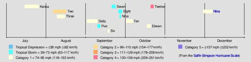 | 13 storms | July 15 – December 6 | 140 mph (225 km/h) | $100,000 | 21 | ||||