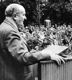 ![]() Minister for Social Affairs Gustav Möller giving a speech on pensions at a senior citizens' meeting at Skansen, Stockholm on 12 July 1957. | |||||||||||||||||||||||||