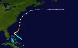 A low pressure area developed north of Hispaniola from a dissipating cold front, organizing into a tropical depression on October 15. The system moved to the north-northeast, attaining peak winds of 50 mph (80 km/h), based on reports from ships. On October 17, the storm transitioned into an extratropical cyclone as it interacted with an approaching cold front. The storm continued northeastward, merging with a larger storm on October 19 to the south of Atlantic Canada.[39]