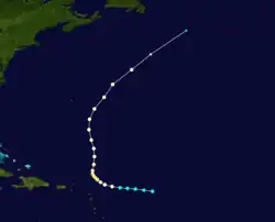 A ship on September 4 indicated a tropical depression developed from a tropical wave to the east of the Lesser Antilles. The system initially had two circulations that consolidated into one by September 5. That day, Hurricane Hunters observed 55 mph (89 km/h) winds, which prompted the Weather Bureau to upgrade it to Tropical Storm Fifi.[1] Due to the storm's fast track to the northwest, a gale warning and hurricane watch were issued for the Leeward and northern Windward Islands.[27] On September 6, Fifi intensified into a hurricane and reached peak winds of 85 mph (137 km/h), around the same time that it passed about 150 mi (240 km) northeast of the Leeward Islands.[1] Later, Fifi began weakening, and by September 8 it was downgraded to tropical storm status.[12] The westerlies turned Fifi to the northeast on September 10.[1] After passing southeast of Bermuda, the storm dissipated on September 11.[12]