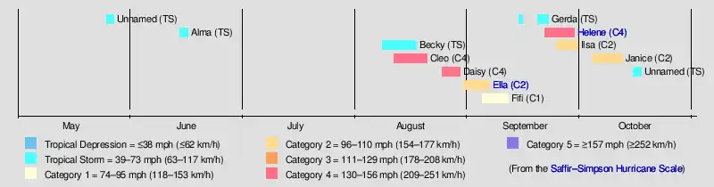 In May, a subtropical depression formed in the Caribbean and dropped heavy rainfall near Miami, Florida. The first named storm of the season was Alma, which killed three people and caused flooding in Texas. Hurricane Daisy in August was a major hurricane that paralleled the eastern coast of the United States, although due to its small size it did not cause much damage. Hurricane Ella affected much of the northern Caribbean and Texas, most significantly the Dominican Republic where 30 people died. Ella also killed six people in Cuba, where it made landfall as a major hurricane. A few weeks later, Tropical Storm Gerda also struck the Dominican Republic and killed three people. The costliest storm of the season was Helene, which caused $11.2 million in damage (1958 USD), mostly in North Carolina. Although it passed within 10 mi (16 km) of the state, its effects were mostly limited to the coast, and the hurricane killed one person. The last storm of the season, Janice, killed eight people in Jamaica when its precursor dropped 20 in (510 mm) of rainfall, and one person was killed in the Bahamas.