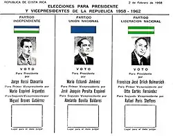 General elections were held in Costa Rica on 2 February 1958.[ 1] Mario Echandi Jiménez of the National Union Party won the presidential election, whilst the National Liberation Party won the parliamentary election. Voter turnout was 64.7%.[ 2]