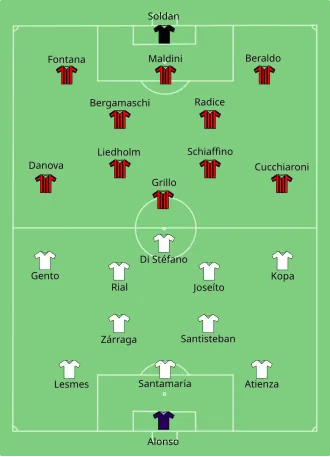 - ^ Santamaría, who represented his native Uruguay from 1952 to 1957, later switched to representing Spain internationally. However, his first cap for Spain would not come until October 1958, five months after this match was played.[6]
