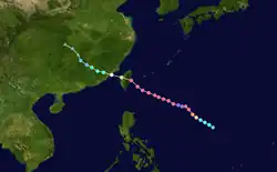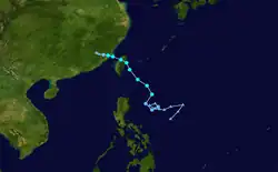 Tropical Storm Winnie formed on July 12 to the east of Luzon. It moved northwestward, rapidly intensifying to a Category 4 typhoon within 12 hours. The typhoon weakened slightly, but rapidly strengthened to a 175-mile-per-hour (282 km/h) super typhoon just before hitting eastern Taiwan on the 15th. Winnie rapidly weakened over the mountainous terrain, and after crossing the Formosa Strait Winnie hit southeastern China. It continued to weaken over land, and dissipated on the 17th.[5] Winnie caused 31 casualties and 53 injuries in Taiwan while crossing.[6]