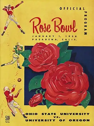The 1958 Rose Bowl was the 44th edition of the college football bowl game, played at the Rose Bowl in Pasadena, California, on Wednesday, January 1. The heavily favored Ohio State Buckeyes of the Big Ten Conference defeated the Oregon Ducks of the Pacific Coast Conference by a score of 10–7.[4][5][6][7]