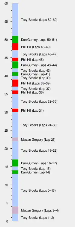 Also uniquely in Formula One World Championship history, the race was divided into two heats. In the first, Tony Brooks and Dan Gurney took the lead. Masten Gregory in the Cooper-Climax battled hard with them, passing first one Ferrari then the other as the lead changed hands until a big end bolt broke. It was a Ferrari 1-2-3 with Phil Hill taking the final podium place. In the second heat, once again the Ferraris had a duel at the front, this time with Bruce McLaren until he suffered transfer gear problems. On aggregate placings, it was an all-Ferrari podium in the order Brooks, Gurney, Hill. Maurice Trintignant was fourth from Jo Bonnier and Ian Burgess. This was the fastest Formula One race recorded at this time, with an average speed of 143.3 miles per hour. Hans Herrmann crashed his BRM P25 five laps into the second heat. In the approach to the southern turn he struck hay bales and rolled his car, but was thrown clear and sent sliding down the track. While the car was destroyed, Herrmann escaped unscathed.[1] Because of this incredible luck Herrmann got his nickname 'Hans im Glück'.