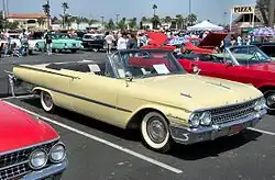 The 1960 Ford looked all-new with twin headlights riding in a scalloped-square front clip. The Fairlane was now the base model in the full-sized lineup, along with the Fairlane 500, Galaxie and range-topping Starliner.[4] The Station Wagon Series continued with Ranch Wagon, Country Sedan and Country Squire models.[4] The elegant Starliner 2-door hardtop was Ford's choice for NASCAR racing. The 1960 fullsize Fords abandoned the ostentatious ornamentation of the 1950s for a futuristic, sleek look. Round taillights were replaced by half-moon shaped taillights for 1960 only. There were tailfins still, but smaller ones – the focus of Ford's stylists abandoning, as did the rest of the industry, the aviation influences of the previous decade and instead capturing the new obsession – the Space Race. The Galaxie name was particularly appealing to this trend, it seems. Windshield wipers were extended to cover more of the windshield.[5] Ford also introduced the center rear fuel door lid.[6] Engines offered for 1960 were the 223 cubic inch six and 292 & 352 V8s. A midyear introduction was the Hipo 352CI with 360 HP. This was Ford's first engine with over 1HP per cubic inch displacement. With the change in dimensions from 1959, the New York Times described the 1960 full-size Ford as the "longest, lowest, and widest in the fifty-six year history of the Ford Motor Company."[7] The car ran afoul of regulations in many states, where vehicles wider than eighty inches were typically trucks, which had lighting requirements not mandated for passenger cars.[8]
