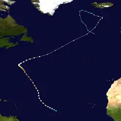 Moving across the Bahamas later on October 18, Gerda accelerated to the north-northeast. The storm curved northeastward on October 20, while peaking with winds of 70 mph (110 km/h).[3] However, a Texas Tower offshore Massachusetts observed hurricane-force winds.[14] At 00:00 UTC on October 20, Gerda transitioned into an extratropical cyclone while situated about 165 miles (265 km) southeast of Nantucket, Massachusetts.[3] Damage from the storm in New England was "about the same as that from a typical wintertime northeaster".[14] The remnants of Gerda moved northeastward and then to the east, before dissipating between Newfoundland and the Azores late on October 22.[3]