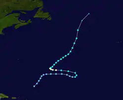 | Six | September 12 – 15 | Tropical storm | 65 (100) | 996 | The Bahamas, East Coast of the United States, Atlantic Canada | Minimal | None | |||