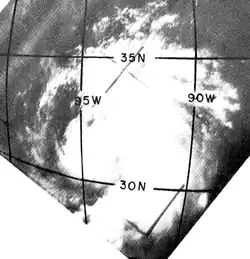 On August 26, a tropical depression formed in the western Gulf of Mexico about 280 mi (450 km) northeast of Tampico, Tamaulipas. It moved slowly to the north-northwest around a ridge without intensifying beyond winds of 30 mph (45 km/h). The system encountered wind shear throughout its duration, which displaced the convection from the center to its northeast. The depression struck just west of the Texas/Louisiana border on August 29 before dissipating on August 30. Rainfall in Texas was minimal, estimated around 1 in (25 mm). However, heavy amounts of precipitation fell across Louisiana, peaking at 23.13 in (588 mm) near Hackberry. Rainfall extended northeastward through Arkansas and Missouri.[3][21] On August 29 as the depression moved ashore, heavy rainfall caused street flooding in Cameron, Louisiana. Two tornadoes were reported in the town, one of which produced winds of 80 mph (130 km/h).[22] The storms damaged 115 houses or trailers, of which one was destroyed. There were 30 people injured, of whom 18 required hospital attention,[23] and there were three deaths.[22]