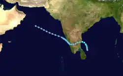Cyclonic Storm One existed from May 14 to May 22.[3] The storm moved from east to west, forming on May 14 and slowly moving northward. On May 15, it started moving northwestward, then later westward as it strengthened. It made a landfall on northern Tamil Nadu, moving west-southwestward with 1-minute sustained winds of 40 miles per hour on May 16 after strengthening into a low-end tropical storm-strength tropical cyclone. It then crossed India and resurfaced in the Arabian Sea early on May 18, also turning northwest in the meantime. The storm spent the rest of its lifetime slowly moving northwest as a tropical depression, eventually dissipating on May 22 a few hundred kilometers south of Pakistan.
