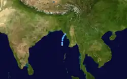After making landfall in Thailand, the system continued westward, then curved to the northeast, probably regathering strength and making landfall near Chittagong in East Pakistan on October 30 before rapidly dissipating.[13]