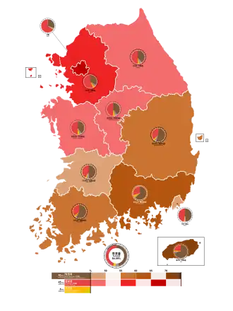 | Jeonnam | 765,712 | (57.2%) | 480,800 | (35.9%) | 51,714 | (3.9%) | 17,312 | (1.3%) | 22,604 | (1.7%) | 1,338,142 | ![]() |