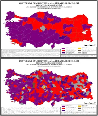 Local elections were held in Turkey on 17 November 1963. In the elections, both the mayors and the local parliaments (Turkish: İl Genel Meclisi) were elected. The figures presented below are the results of the local parliament elections.[1][2]