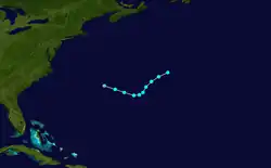 While situated about 300 mi (485 km) east of Bermuda on July 31, it began heading northeastward. Later that day, the depression finally organized further and developed a well-defined rainband. The Atlantic hurricane database indicates that the depression strengthened into a tropical storm at 18:00 UTC on July 31, due to ships reports of winds reaching 46 mph (74 km/h).[11][3] On August 1, it intensified further into a hurricane. Around that time, maximum sustained winds peaked at 85 mph (137 km/h).[3] The storm continued moving rapidly northeastward and began to interact with a cold front.[11] It transitioned into an extratropical cyclone on August 2, while located about 525 mi (845 km) east of Cape Race, Newfoundland.[3]