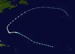 By late on September 12, the storm curved northeastward and passed to the northeast of Bermuda early the next day,[3] bringing 4.05 in (103 mm) of precipitation and wind gusts up to 70 mph (110 km/h).[29][30] Throughout the island, low-lying areas were flooded and trees were felled. At St. George's Island, residents were briefly left without electricity and telephones and the causeway linking St. George's Island to the main island was inundated.[31] Early on September 13, Ethel intensified into a Category 2 hurricane and soon peaked with winds of 105 mph (169 km/h). The system became extratropical late on September 14, while located about 255 mi (410 km) southeast of Cape Race. Newfoundland. The extratropical remnants slowly weakened while meandering around the Atlantic, until dissipating just north of the Azores on September 17.[3]