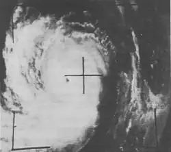 TIROS observed a large cloud mass near 18°N, 37°W on September 4.[29] It developed into a tropical depression early that day while located about 665 mi (1,070 km) east of Cape Verde. The depression moved west-northwestward and intensified into Tropical Storm Ethel at 18:00 UTC on September 4.[3] Initially, it was suggested that Hurricane Dora could absorb Ethel, as the storms were located 690 mi (1,110 km) apart.[29] On September 7, Ethel strengthened into a hurricane. By early on the following day, it curved westward and continued to slowly deepen, before turning to the north-northwestward on September 11.[3]