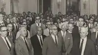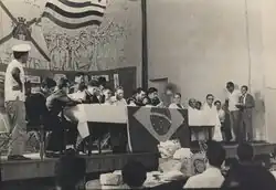 The celebration of the association's second anniversary on 25 March had been announced since January.[97] It was scheduled to take place at the Metalworkers’ Union, the "Steel Palace", at 19:00. The president of Brazil was invited but did not attend, following advice from the Navy Minister.[98] Most historians note that the navy prohibited the event, but minister Mota never claimed to have issued such a prohibition in his 1964 testimony. Instead, he contested the meeting on other legal grounds, such as the prohibition of public demonstrations regarding internal and political matters. The arrest warrants were issued for the events of 20 March.[89] The anniversary itself was legal: the AMFNB was a registered civil entity, the sailors were off duty, and the celebration did not take place in a military facility.[99]