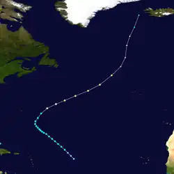 A cold front moved eastward from North America into the western Atlantic Ocean on August 28. An extratropical low developed on August 31 over the north Atlantic, which degenerated into a trough three days later. On September 4, another extratropical storm developed, located about 800 mi (1,285 km) south of Newfoundland. The system attained gale-force winds a day later, and turned westward on September 6, steered by a building ridge to the north. On September 7, the storm transitioned into a tropical storm, after its wind field became more symmetrical. Later that day, the storm attain winds of 60 mph (95 km/h), recorded by nearby ships. The storm turned to the east and northeast, crossing over its former path. On September 10, the tropical storm again transitioned into an extratropical storm, which later passed southeast of Newfoundland. The storm moved across the northern Atlantic Ocean, dissipating on September 13 southwest of Ireland.[4]