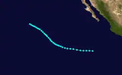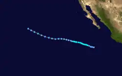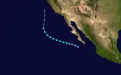 During the afternoon of August 7, a tropical depression formed 150 miles southwest of Cabo San Lucas, Mexico. On August 8, the cyclone strengthened into Tropical Storm Claudia. At that time, Claudia was reaching its peak intensity of 50 mph (80 km/h), while also beginning to recurve to the north. The storm remained at peak intensity while re-curving until August 10 when the wind speeds decreased slightly and advisories were discontinued. [1] The storm never affected land.