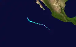 Early on the morning of June 17, a tropical depression formed 185 miles (298 km)/h) west of Puerto Angel, Mexico. The depression strengthened into Tropical Storm Wallie. Meanwhile, Wallie was at its peak intensity of 50 mph (80 km/h).[1] Wallie headed northwest and degenerated into an area of low pressure just off the Mexican coast early on June 18.[1] The remnant low made landfall in the near Zihuatanejo, Mexico early on June 18. The low dissipated later that day.[1]
