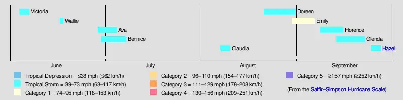 On June 4, a tropical depression formed 585 miles (941 km) southwest of Acapulco, Mexico Early the next day, the depression system intensified into the first tropical storm of the season and was named Victoria. At that time, the storm was at its peak intensity of 50 mph (80 km/h) which it retained while moving the northwest. Early on June 7, the tropical storm weakened into a tropical depression before dissipating six hours later. [1] In all, Tropical Storm Victoria stayed at sea.